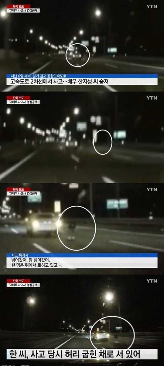 Trong video quay lại từ hộp đen của chiếc xe hơi khác tại thời điểm xảy ra tai nạn, xe Han Ji Seong dừng và bật đèn báo khẩn cấp trên làn đường thứ hai. Sau đó, cặp vợ chồng xuống xe cùng lúc. Chồng của cô tiến vào phía lề đường để đi vệ sinh, trong khi Han Ji Seong cúi người phía sau chiếc xe.