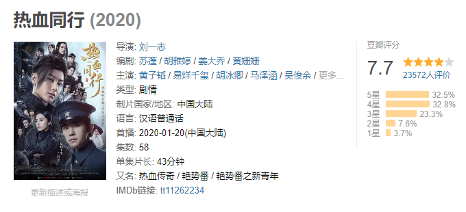 Trong ba tác phẩm được phát sóng, Nhiệt huyết đồng hành do Dịch Dương Thiên Tỉ đảm nhận vai chính sau khi ra mắt đạt được danh tiếng rất tốt, nhận được điểm đánh giá 7.7 điểm trên Douban với hơn 20 ngàn người đánh giá, bốn sao và năm sao chiếm hơn 30%.