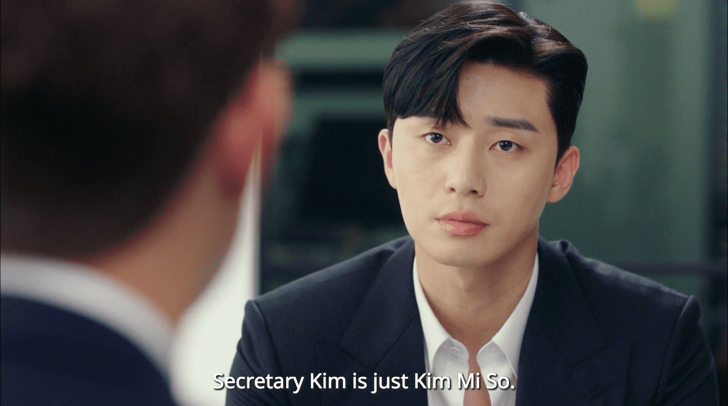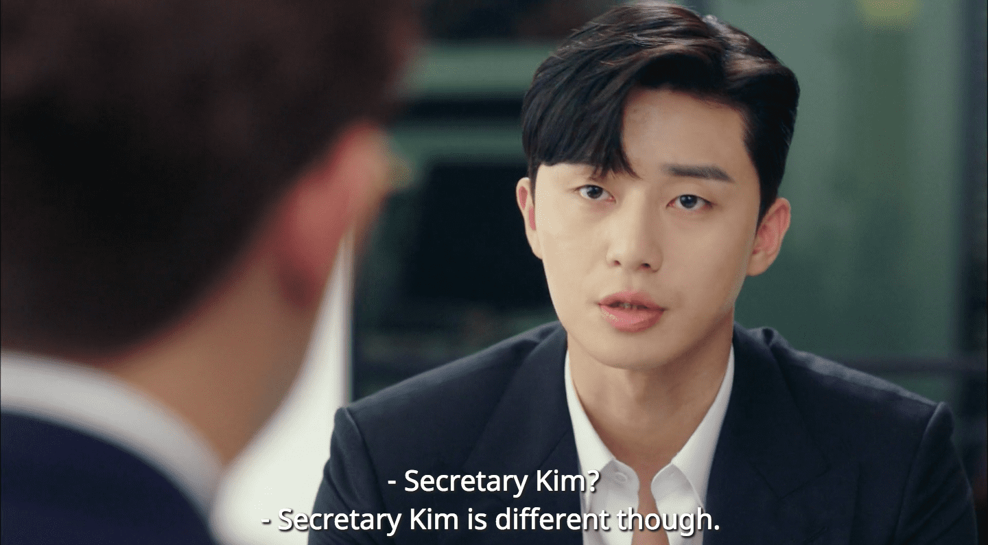 Có một vài tình tiết ngôn tình được biên kịch cố tình gợi ý thông qua nhân vật Lee Young Joon (Park Seo Joon) trong suốt tập đầu tiên của bộ phim. Chẳng hạn như việc chàng sếp Lee tài giỏi, đẹp trai bị bệnh “tự” yêu bản thân, chưa bao giờ có một mối tình nào đàng hoàng. Anh không hề hư hỏng hay đốn mạt, chỉ đơn giản là vì anh đã có thư ký Kim xinh đẹp bên cạnh. Sự hiện diện của nàng thư kí xinh đẹp như chiếc chìa khóa khóa chặt cánh cửa bước đến con tim anh của biết bao cô gái khác.