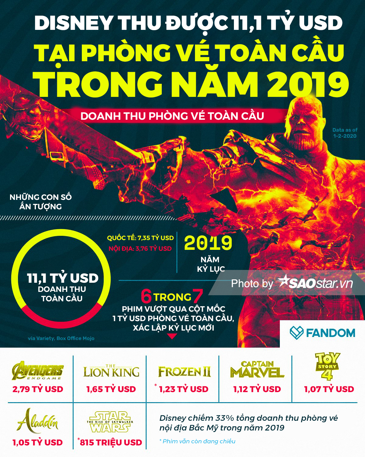 Ngay cả khi không có Fox, Disney đã cũng mang về 11,1 tỷ USD - điều mà không có hãng phim nào khác chạm tới gần được. Disney có sáu tựa phim đạt ít nhất 1 tỷ USD, với Avengers: Endgame lập kỷ lục toàn cầu với 2,79 USD, vượt qua Avatar của James Cameron. Các bom tấn lớn khác là The Lion King (1,65 tỷ đô la), Captain Marvel (1,1 tỷ đô la) và Aladdin (1 tỷ đô la).