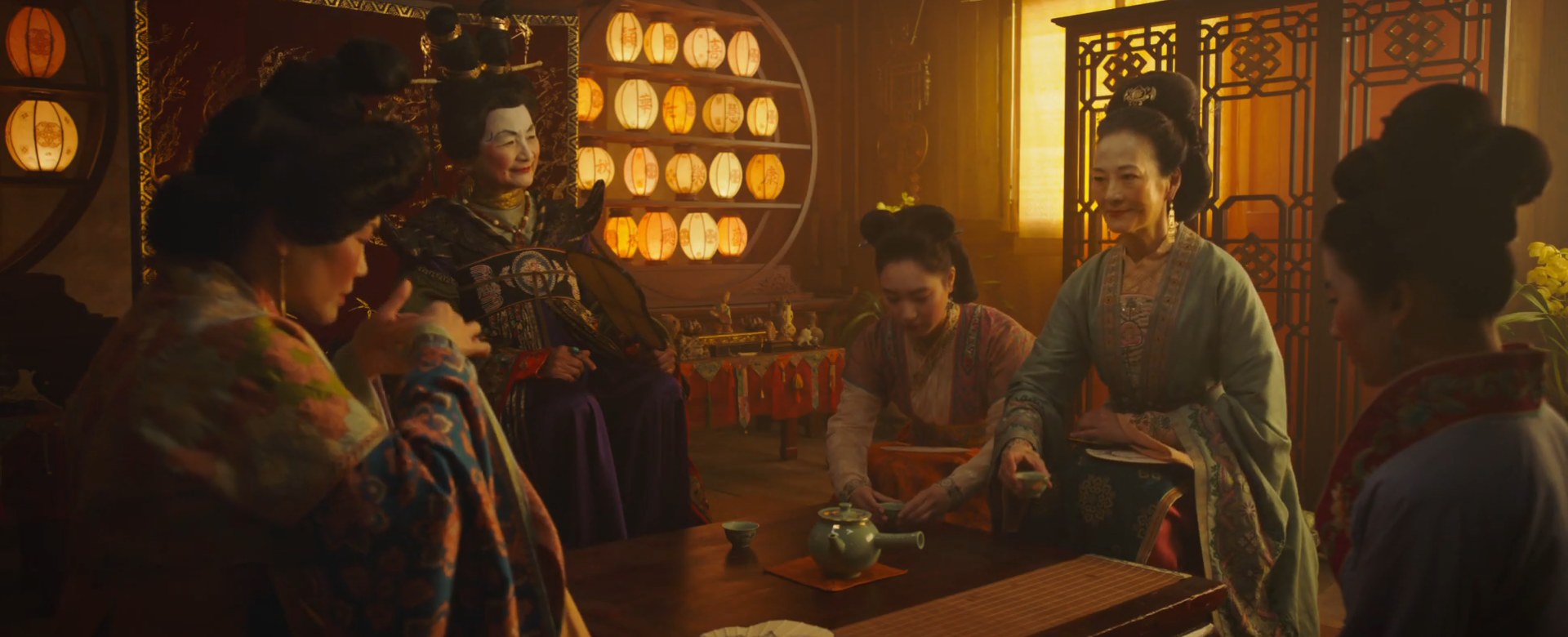 “Đây là những phẩm chất mà chúng ta thấy ở Mulan. Khi một người vợ phục vụ chồng, cô ấy phải im lặng, cô ấy phải vô hình.” Một con nhện rơi xuống từ trần nhà và gần ấm trà. Mulan che nó bằng cái nồi nhưng được bảo giữ nó ở giữa bàn. Họ chuyển cuộc tranh luận nhưng Mulan không thể tập trung vào đấy. Con nhện nhảy lên một trong những người phụ nữ và hỗn loạn xảy ra. Cái bàn bị lật đổ và Mulan cố gắng chụp lấy những bình ly tách trên đó.