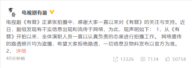Đoạn tin do phía đoàn phim Hữu phỉ đăng tải trên Weibo như sau: