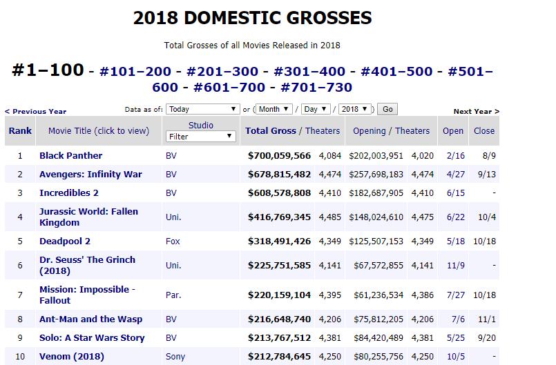 Dẫn đầu doanh số phòng vé Bắc Mỹ hiện nay là bộ phim của Disney và Marvel - Black Panther với 700 triệu USD nội địa. Theo sau là Avengers: Infinity War (678,8 triệu USD) và Incredibles 2 (608,6 triệu USD) - cả hai phim đều của Disney. Vị trí thứ 4 và 5 thuộc về Jurassic World: Fallen Kingdom của Universal (416,8 triệu USD) và Deadpool 2 của Fox (318,5 triệu).