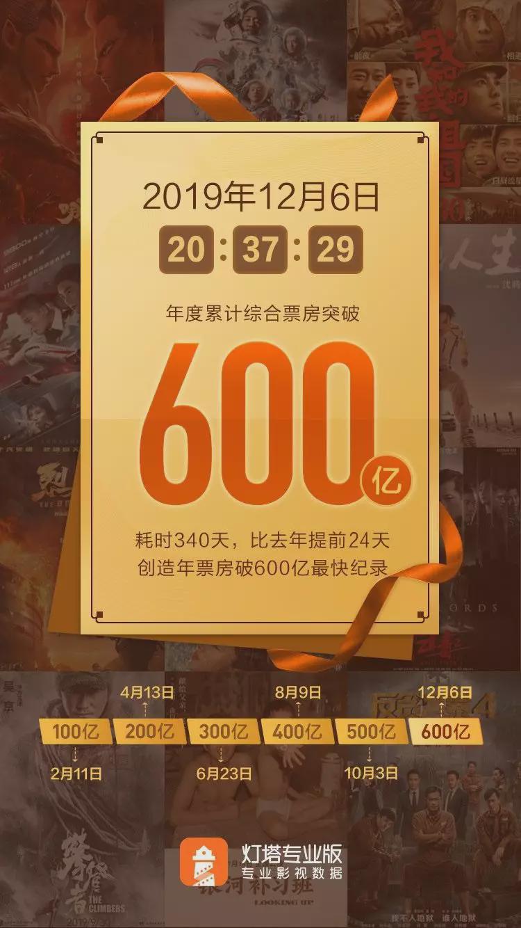 Theo số liệu của văn phòng chuyên phụ trách thống kê doanh thu phòng vé toàn quốc tính theo thời gian thực tế (06/12/2019), doanh thu phòng vé của phim điện ảnh Hoa ngữ năm 2019 đã vượt hơn con số 60 tỷ NDT (hơn 8,5 tỷ USD). Tốc độ đạt được doanh thu này nhanh hơn cả doanh thu phòng vé vào năm trước khoảng 24 ngày.