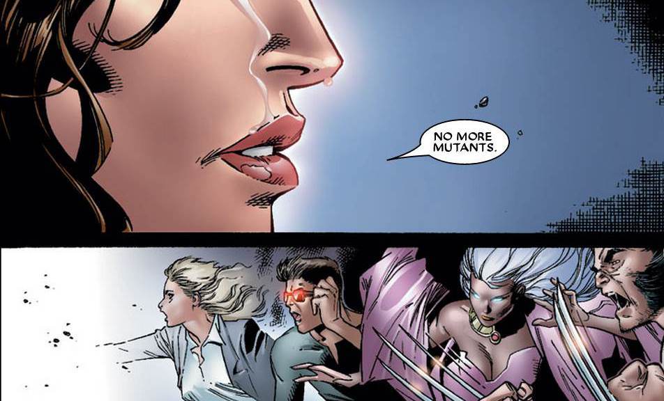 Điều này vô tình giải phóng một con quỷ có tên Mephisto. Chính hắn đã bắt cóc và hủy hoại Vision. Dẫu cho sau này, Vision đã được tái tạo lại cơ thể, nhưng cảm xúc trong anh đã không còn, khiến anh không còn là bản thân mình như trước đó nữa. Điều này khiến Scarlet Witch dường như phát điên, và rồi năng lực thay đổi hiện thực của cô trở nên mất kiểm soát. Cô đã dùng chính sức mạnh đó để tạo nên một thế giới trong mơ, nơi mà mọi người đều đạt được nhưng mong muốn của mình. Tại thế giới đó, X-Men Magneto chính là bá chủ, và hiển nhiên là thực tại đó nhanh chóng bị sụp đổ. Các siêu anh hùng dần lấy lại trí nhớ của mình và chống lại cô, Doctor Strange chính là người đầu tiên khơi mào cho mọi thứ. Scarlet Witch đã vô cùng tức giận khi các siêu anh hùng yêu cầu cô trả họ về thế giới cũ, và chỉ với 3 từ “No more mutants” (Không còn dị nhân nữa) cô quét sạch năng lực của 90% dị nhân có mặt lúc đó. Không dừng lại ở đó, việc thay đổi thực tại và đẻ cong nhánh không gian đã khiến cho toàn bộ vũ trụ phải đối mặt với những thách thức vô cùng to lớn.