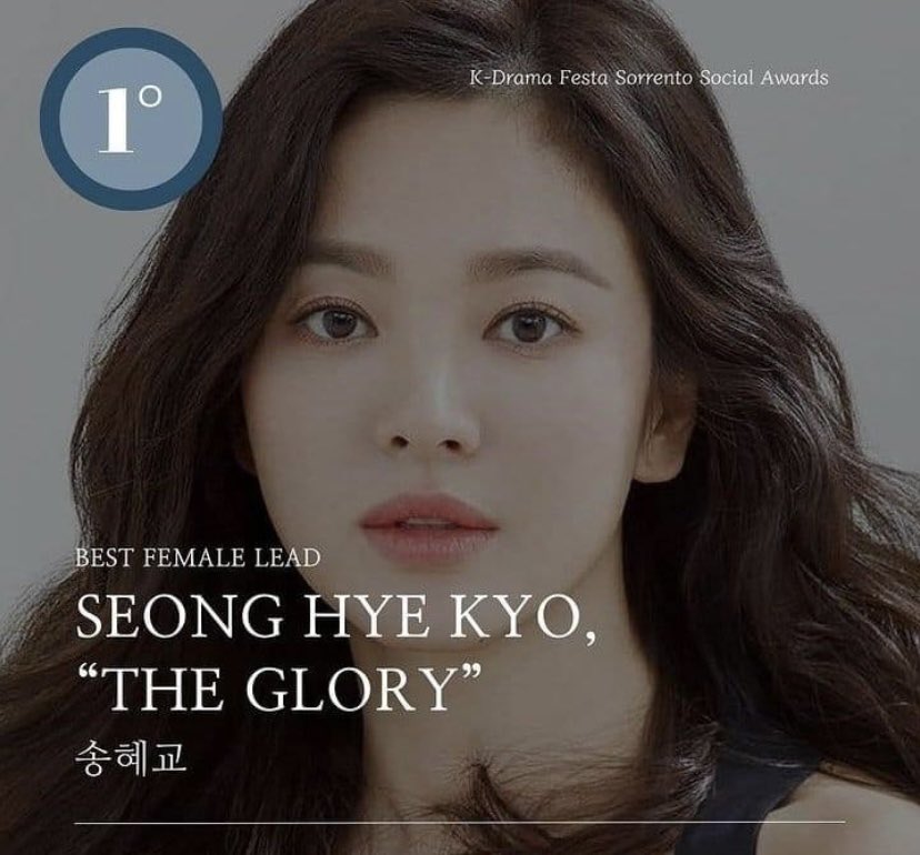 Theo đó, truyền thông Hàn vừa đưa tin, Song Hye Kyo vừa nhận giải Best Female Lead tại Kdrama Festa Sorrento Social Awards. Đây là lễ trao giải có tiếng, nhằm tôn vinh những cá nhân, tổ chức có đóng góp tích cực cho mảng phim ảnh. Sự kiện năm nay được tổ chức ở Ý, quy tụ sự tham gia của nhiều ngôi sao đình đám của Hàn Quốc và quốc tế. Được biết, Song Hye Kyo không tham gia dự sự kiện, cô hiện đang nghỉ ngơi, đọc kịch bản mới sau thành công của The Glory.
