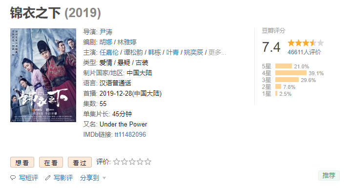 Cẩm y chi hạ chính thức ra mắt khán giả vào ngày 28/12/2019 và bộ phim đã xuất sắc đạt 7,4 điểm đánh giá trên trang Douban với 60,1% đánh giá 4 sao và 5 sao, chỉ có 10,3% đánh giá 1 sao và 2 sao. Đây thực sự là một kết quả vô cùng đáng tự hào của bộ phim này.