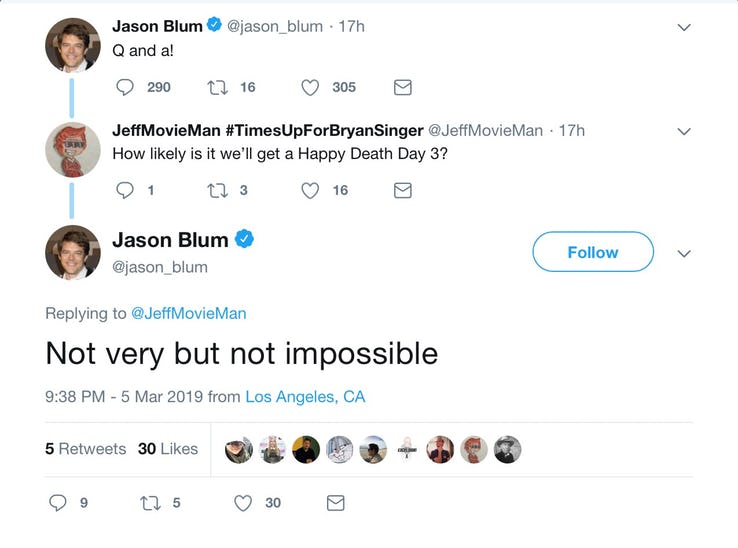 Trong tuần này, ông Blum đã giải đáp rất nhiều thắc mắc trong mục hỏi đáp được ông thực hiện trên Twitter. Khi được hỏi liệu có khả năng ông sẽ tiếp tục sản xuất phần 3 của loạt phim này không, ông đã trả lời rằng “không chắc chắn lắm không phải là không có khả năng”
