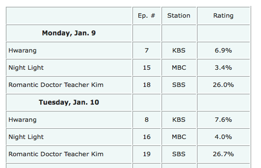 Thời gian gần đây, bộ phim Huyền thoại biển xanh do Lee Min Ho và Jun Ji Hyun đảm nhận vai chính hay Goblin với sự tham gia của Gong Yoo là những cái tên “hot” đối với các fan phim Hàn tại Việt Nam. Tuy nhiên, theo thống kê mới nhất về rating của các bộ phim Hàn được chiếu trong thời điểm này, Romantic Doctor Teacher Kim mới là bộ phim đạt rating cao nhất, đánh bật hầu hết các đối thủ còn lại.