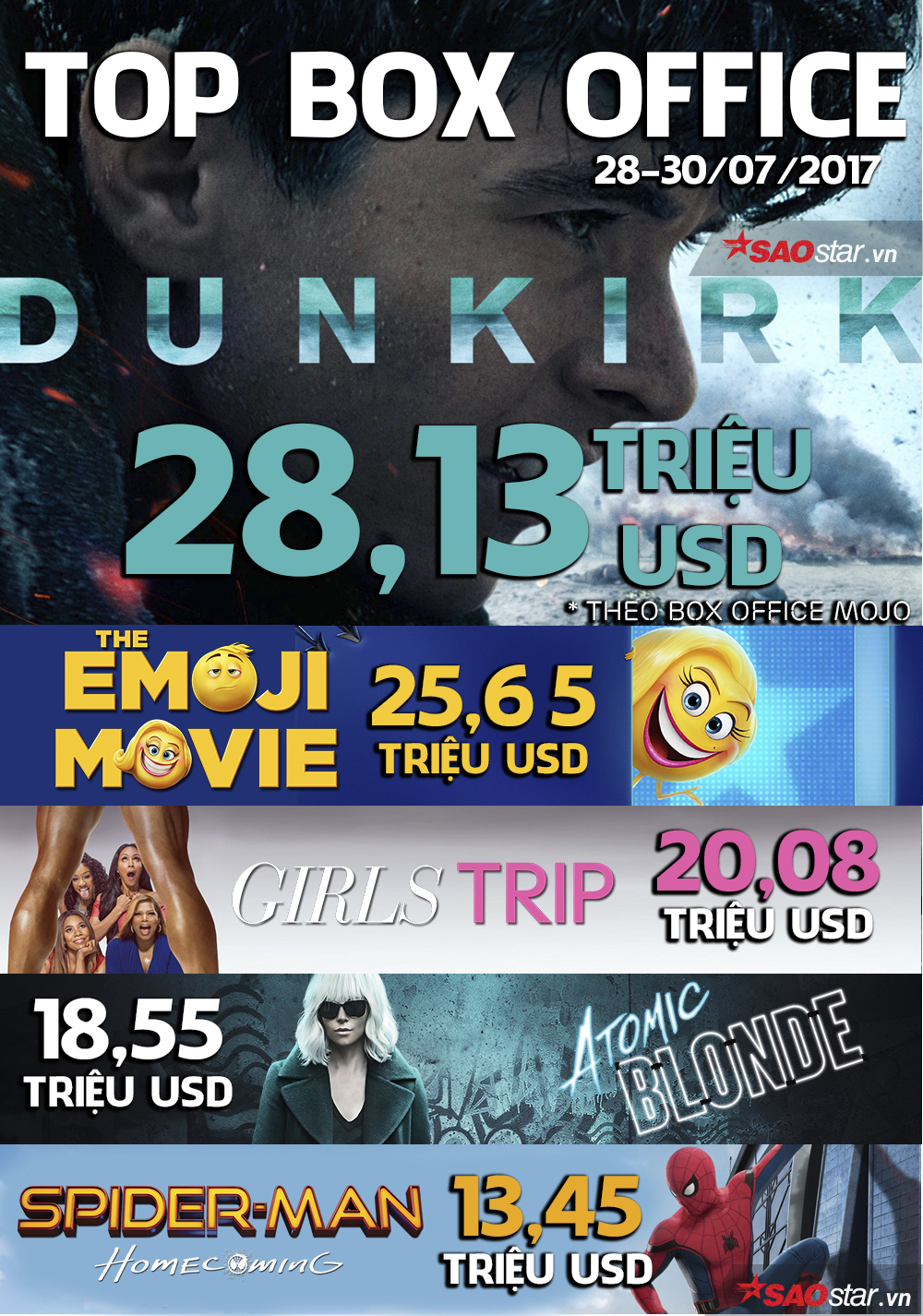 Cuối tuần vừa qua, thị trường Bắc Mỹ đã đón chào những phim mới như The Emoji Movie, Atomic Blonde, bên cạnh với sức nóng của Dunkirk, Girls Trip, Spider-Man: Homecoming… Tưởng chừng bảng xếp hạng doanh thu sẽ có biến động lớn bởi những cái tên mới, thì bất ngờ Dunkirk vẫn giữ vị trí đứng đầu doanh thu, dù đã giảm 44% so với tuần trước.