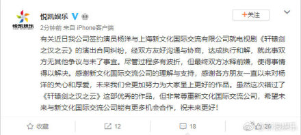 Hai bên cũng không còn sự tranh luận hay những chuyện chưa giải quyết gì nữa. Mặc dù trong quá trình có chút khúc mắc nhưng đến cuối cùng cũng đã giải quyết. Cảm ơn sự ủng hộ và thấu hiểu của công ty giao lưu quốc tế Tân văn hóa, cảm ơn sự quan tâm và hậu ái của bạn bè nhiều nơi vẫn luôn giành cho Dương Dương, tương lai chúng tôi sẽ nổ lực hơn nữa mang đến những tác phẩm tốt nhất. Mặc dù lần này đã bỏ lỡ Hiên viên kiếm chi hán chi vân - một tác phẩm ưu tú như thế này nhưng cũng vô cùng tôn trọng công ty hữu hạn quốc tế Tân văn hóa, hy vọng sẽ có nhiều cơ hội hợp tác với công ty hơn nữa trong tương lai. Chúc tương lai sẽ ngày càng tốt đẹp hơn”.