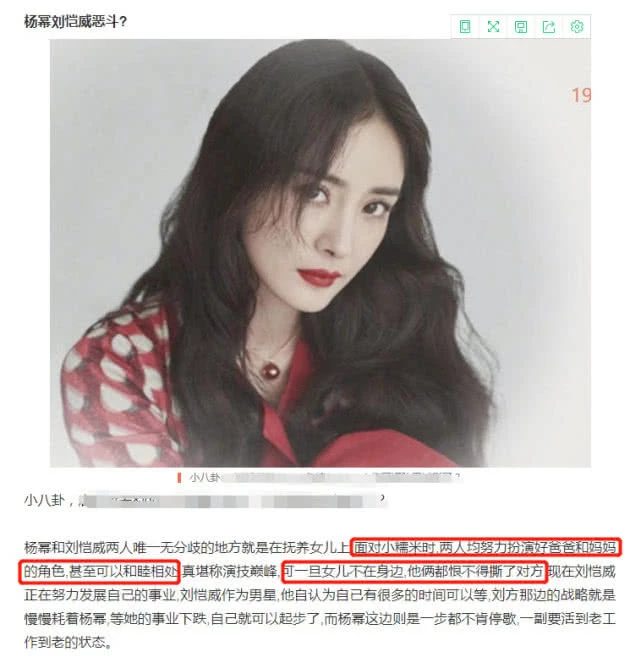 Gần đây, có một số tin tức lan truyền cho rằng mối quan hệ giữa Dương Mịch và Lưu Khải Uy đã xấu đi. Truyền thông của cả hai bày ra đủ trò để chèn ép đối phương, tranh giành tài nguyên, đại ngôn (hợp đồng quảng cáo, phim ảnh). Thế nhưng, trước mặt con gái thì hai người lại đóng vai bố mẹ tốt, thậm chí đụng mặt nhau vẫn vô tư cười nói thân thiện như chưa từng có chuyện gì xảy ra.
