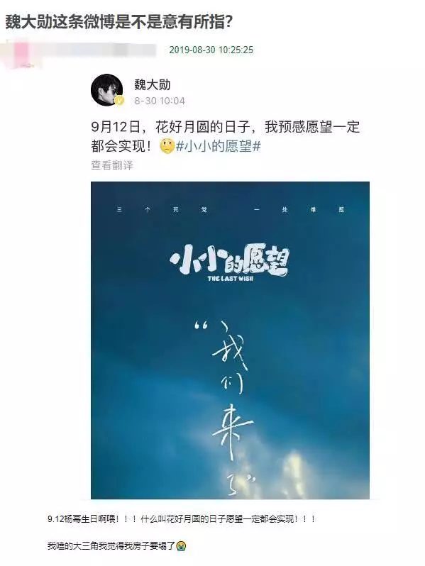 Đang bán tín bán nghi, bên tài khoản Weibo của Ngụy Đại Huân lại đăng một bài viết gây bất ngờ, dường như thả thính cho biết tin đồn là sự thật. Nhìn thoáng qua, nội dung của bài đăng này như một kiểu quảng bá cho phim mới, nhưng với những dòng mà nam diễn viên ghi ra lại có điều gì đó “mờ ám”: “Ngày 12.09, thời gian đoàn tụ sum vầy, tôi dự cảm nguyện vọng nhất định sẽ thực hiện được”.