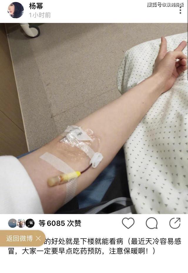 Vào tối ngày 10.01, Dương Mịch đã chụp một bức ảnh đăng lên tài khoản cùng dòng trạng thái: “Ưu điểm của việc quay phim trong bệnh viện là bạn có thể gặp bác sĩ khi bạn đi xuống cầu thang. (Gần nhất trời lạnh dễ gây cảm cúm, mọi người nhất định phải nhớ uống thuốc dự phòng, chú ý giữ ấm!). Trong ảnh có thể thấy trên tay Dương Mịch gắn ống kiêm như vừa mới truyền dịch xong, cô còn ra dáng để tay hình chữ V.