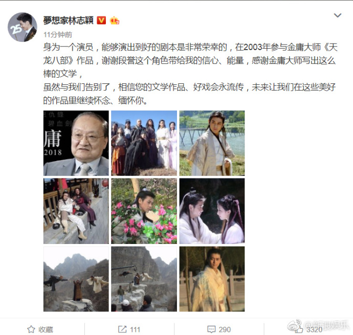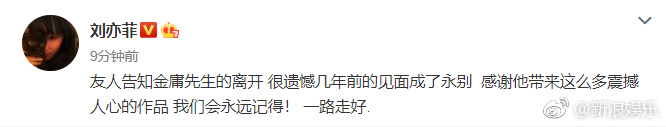 Lưu Diệc Phi: “Bạn bè nói cho tôi biết tin Kim Dung tiên sinh đã qua đời, cảm thấy rất hối tiếc khi lần gặp mặt của mấy năm trước lại trở thành sự vĩnh biệt. Cảm ơn Ông đã mang đến nhiều tác phẩm làm rung động lòng người đến như vậy. Chúng tôi sẽ mãi mãi ghi nhớ! Lên đường bình an. Tạm biệt đại hiệp”.