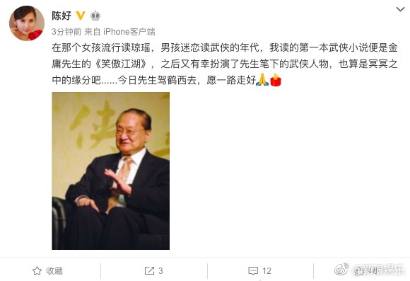 Trần Hảo: “Khi mà thời đại con gái thích đọc tác phẩm của Quỳnh Dao còn con trai lại mê đọc võ hiệp, tác phẩm võ hiệp mà tôi đọc đầu tiên chính là “Tiếu ngạo giang hồ” của Kim Dung tiên sinh. Về sau lại có vinh hạnh được đảm nhận một nhân vật dưới ngòi bút của Ông cũng xem như là có duyên phận rồi. Hôm nay, Kim Dung tiên sinh cưỡi hạc đi Tây thiên, nguyện Ông lên đường bình an!”