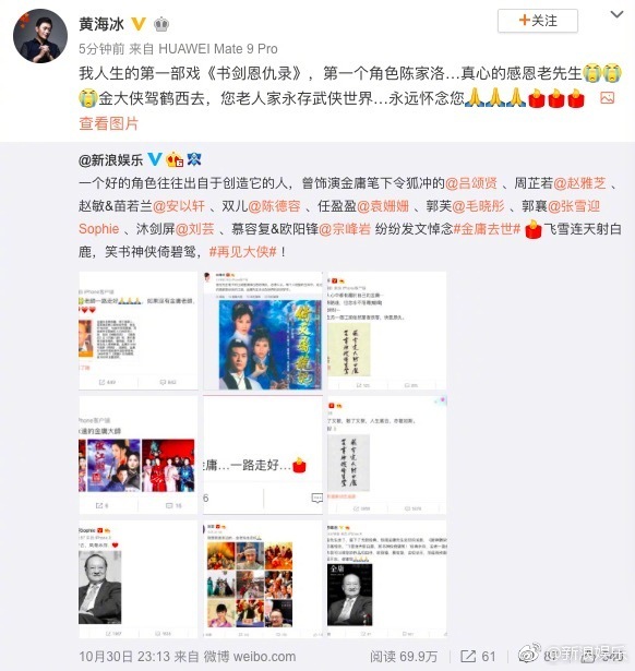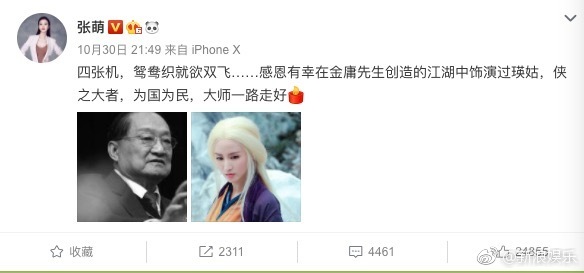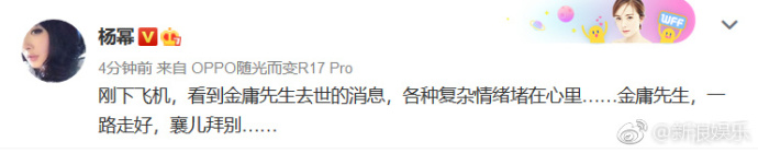 Dương Mịch: “Vừa xuống máy bay, nhìn thấy tin tức Kim Dung tiên sinh qua đời, trong lòng liền nảy sinh nhiều tâm trạng phức tạp khác nhau…. Kim Dung tiên sinh, lên đường bình an. Tương Nhi bái biệt. Tạm biệt đại hiệp”.