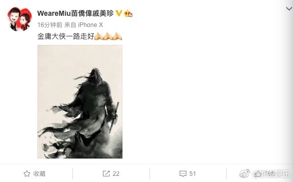 Miêu Kiều Vỹ: “Kim Dung đại hiệp lên đường bình an”.