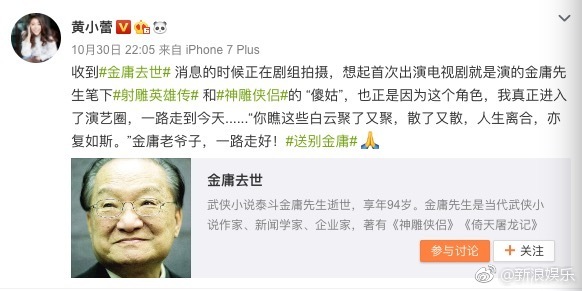 Hoàng Tiểu Lôi: “Lúc nhận được tin “Kim Dung qua đời” là lúc đang trong đoàn quay phim, liền nhớ lại lần đầu đảm nhận vai diễn Cô Ngốc trong bộ phim truyền hình Anh hùng xạ điều và Thần điêu đại hiệp dưới ngòi bút của Kim Dung tiên sinh. Cũng chính nhờ vào vai diễn này mà tôi có thể chính thức bước chân vào ngành giải trí để đi được đến ngày hôm nay. “Ông nhìn mây trắng tụ rồi lại tan, tan rồi lại tụ, nhân sinh ly hợp, diệc phục như tư”. Kim Dung lão gia lên đường bình an. Tiễn biệt Kim Dung”.