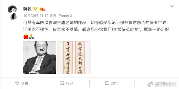 Hàn Đống: “Tôi có vinh hạnh bốn lần được đảm nhận những vai diễn trong tác phẩm của Kim Dung lão sư. Toàn thân có thể cảm nhận được thế giới hiệp giả về những yêu hận tình thù dưới ngòi bút của Ông. Giang hồ mãi không phai màu, truyền kỳ mãi không kết thúc. Cảm ơn Ông đã mang đến “Mộng anh hùng võ hiệp” cho chúng tôi. Nguyện Ông lên đường bình an”.