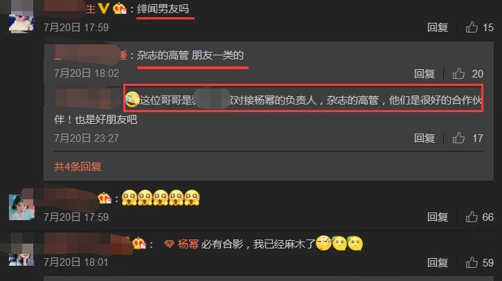Có cư dân mạng bày tỏ liệu đây là bạn trai tin đồn của Dương Mịch hay sao? Nhưng một blogger đã lên tiếng thanh minh thay: “Vị ca ca này là người phụ trách của một sản phẩm hợp tác với Dương Mịch, quản lý cao cấp của tạp chí, họ là những đối tác rất tốt, cũng là bạn tốt của nhau”. Vì vậy mong mọi người có thể tỉnh táo suy xét, không nên quá tin hay bàn tán những điều không đúng sự thật.