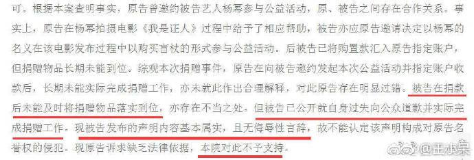 Ngày 20/03, tòa án Bắc Kinh cuối cùng cũng đưa ra kết quả vụ kiện, trong giấy phán quyết ghi rõ: Nguyên cáo (Lý Manh) sau khi đưa ra lời mời tới bị cáo (Dương Mịch) tham gia hoạt động công ích. Bị cáo đã không thực sự hoàn thành việc quyên góp và không đưa ra lời giải thích hợp lý. Nguyên cáo tồn tại cái sai rất rõ ràng, trong khi đó bị cáo cũng có chỗ xử lý không thỏa đáng!