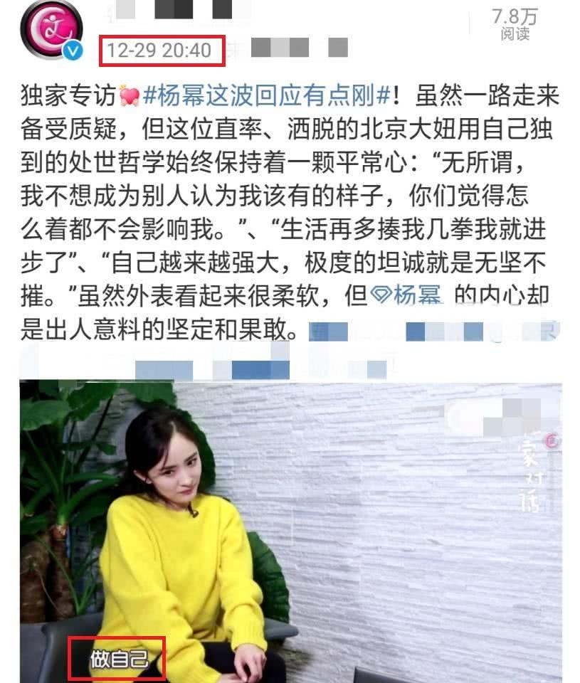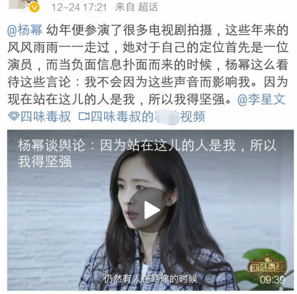 Cũng vào 5h chiều ngày 24 tháng 12 vừa qua, video phỏng vấn của Dương Mịch được tiết lộ, đối với những dị nghị ồn ào xảy ra sau ly hôn, cách nhìn nhận của Dương Mịch là: “Tôi sẽ không để những lời đó ảnh hưởng đến mình, bởi vì người đứng ở đây là tôi, cho nên tôi cần phải kiên cường”.