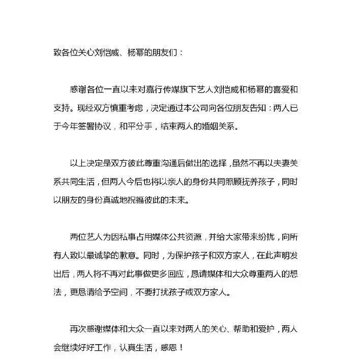 Vào tháng 12 năm 2018, Dương Mịch và Lưu Khải Uy chính thức tuyên bố ly hôn, trong bài viết ly hôn do truyền thông Gia Hành đăng tải cho biết cả hai đi đến quyết định này sau khi đã trải qua quá trình suy nghĩ thận trọng, hôm nay cả hai sẽ lấy thân phận là người thân để cùng nhau nuôi dưỡng Tiểu Gạo Nếp, đồng thời cho biết cả hai, đồng thời cho biết hai người đã ký tên hiệp nghị vào năm ngoái, chia tay hòa bình, kết thúc mối quan hệ hôn nhân của cả hai.