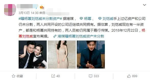 Trước đây, trên mạng từng xuất hiện tin Dương Mịch và Lưu Khải Uy có tài sản trên trăm triệu NDT cùng công ty vẫn chưa được phân chia thì tài khoản trên cũng cho biết, Dương Mịch và Lưu Khải Uy trước mắt vẫn còn duy trì việc sử dụng chung tài sản đầu từ này, trước khi những thứ này được phân chia thì vẫn phải tiếp tục giữ liên lạc với nhau. Mối quan hệ của cả hai cũng vì lợi ích mà có chuyển biến tốt đẹp không ít, Dương Mịch cần sự giúp đỡ thì Lưu Khải Uy cũng không khoanh tay làm ngơ.