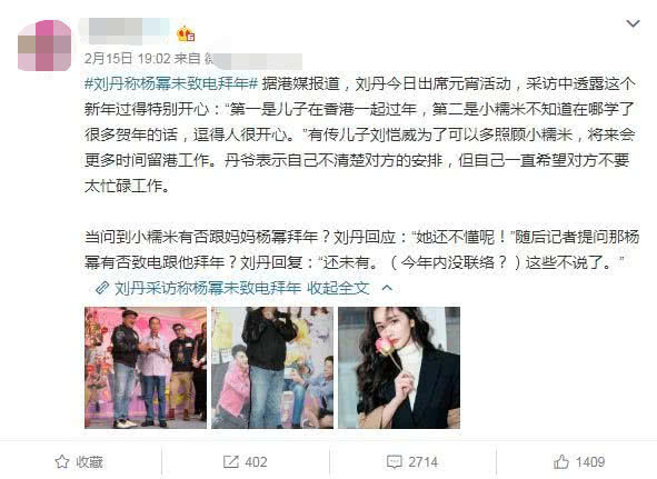 Khi mọi người chuẩn bị cùng nhau đón năm mới thì truyền thông chụp được hình ảnh Lưu Khải Uy cùng với mẹ và Tiểu Gạo Nếp dạo phố trong khi đó Dương Mịch cũng không hề xuất hiện. Không lâu sau, cha Lưu Khải Uy là Lưu Đan trong lúc tiếp nhận phỏng vấn khi bị truy hỏi Dương Mịch liệu rằng có về chúc tết hay không thì Lưu Đan trả lời: “Vẫn chưa có“. Khi ký giả tiếp tục truy hỏi thì Lưu Đan không chịu trả lời tiếp. Về phía Dương Mịch, trong ngày lễ tết cô cũng không bên cạnh đón tết cùng con gái Tiểu Gạo nếp, chọn lựa gia nhập vào đoàn phim.