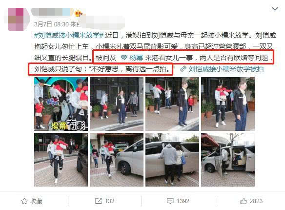 Vào tháng 3, Dương Mịch với bộ quần áo đơn giản, thoái mái xuất hiện ở Hong Kong thăm con, đoàn tụ cùng con gái. Thế nhưng sau đó lại là Lưu Khải Uy đón con tan học, khi ký giả hỏi có liên lạc với vợ trước hay không thì Lưu Khải Uy không bận tâm, chỉ trả lời một câu: “Thật ngại quá, có thể đứng cách xa ra một chút chụp được không“.