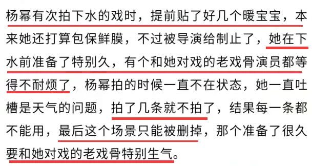 Đối phương còn cho biết Dương Mịch quay mấy cảnh ngày hôm đó cô luôn không ngừng than về thời tiết, quay được mấy cảnh thì không chịu quay nữa, nên những cảnh còn lại đành phải cắt, chọc tức diễn viên lâu năm này. (Hôm đó diễn cảnh tay đôi với Dương Mịch).
