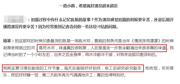 Dương Mịch trong lúc tiếp nhận phỏng vấn cũng nhắc đến cảnh quay dưới nước này, Dương Mịch nói rằng dòng sông mà cô quay lúc đó chính là dòng sông mà Triệu Vy quay trong Tân dòng sông ly biệt, trong nước có mùi hôi thối. Sau khi quay hơn một tiếng, từ trong nước bước lên toàn thân cô đều ngứa.