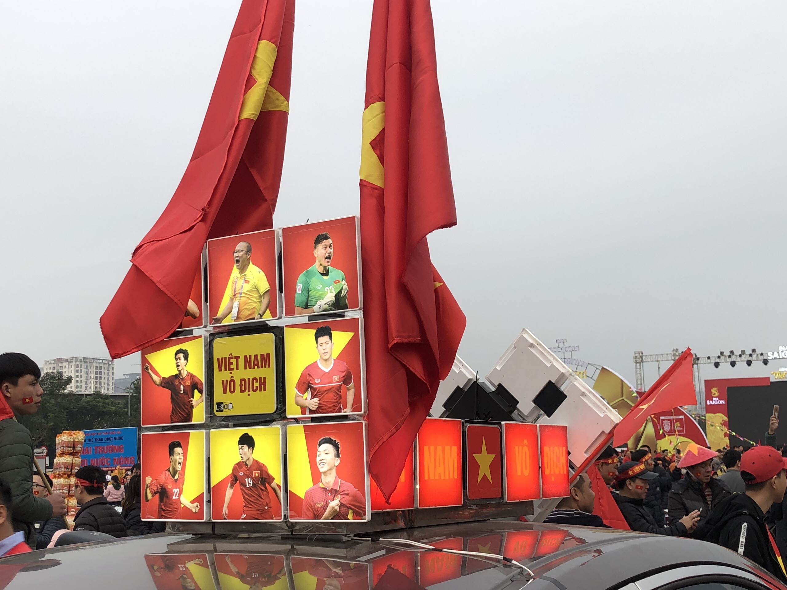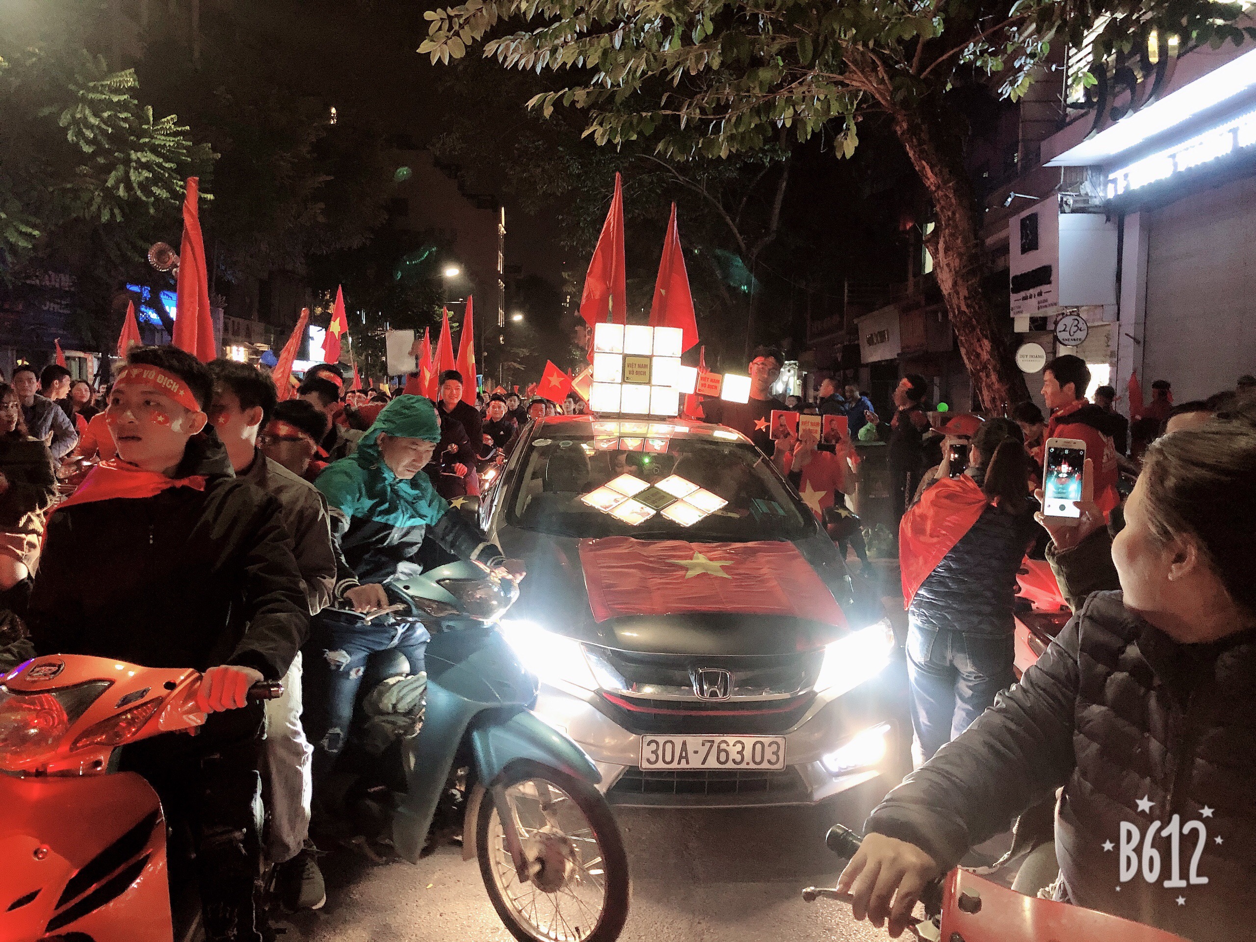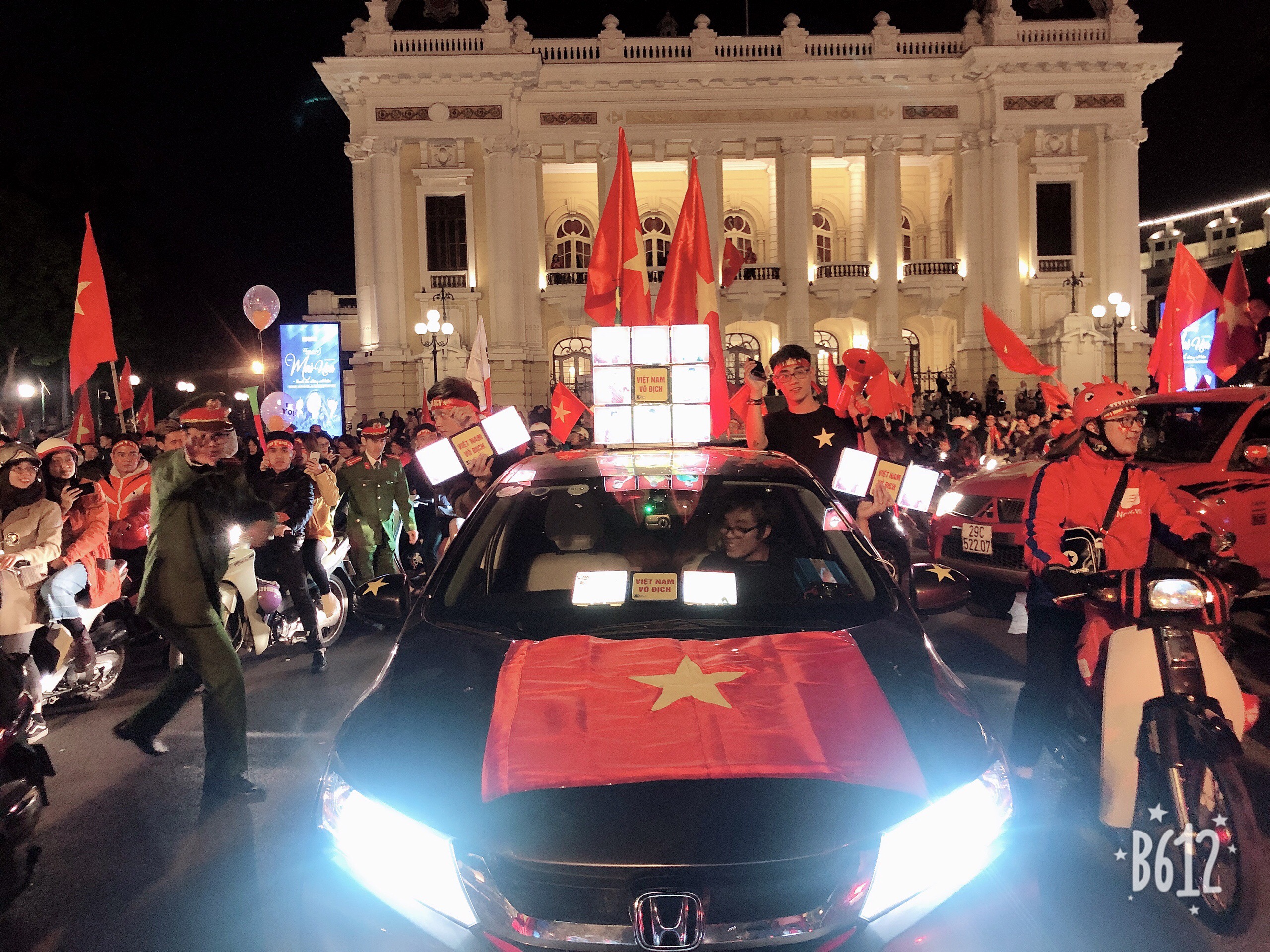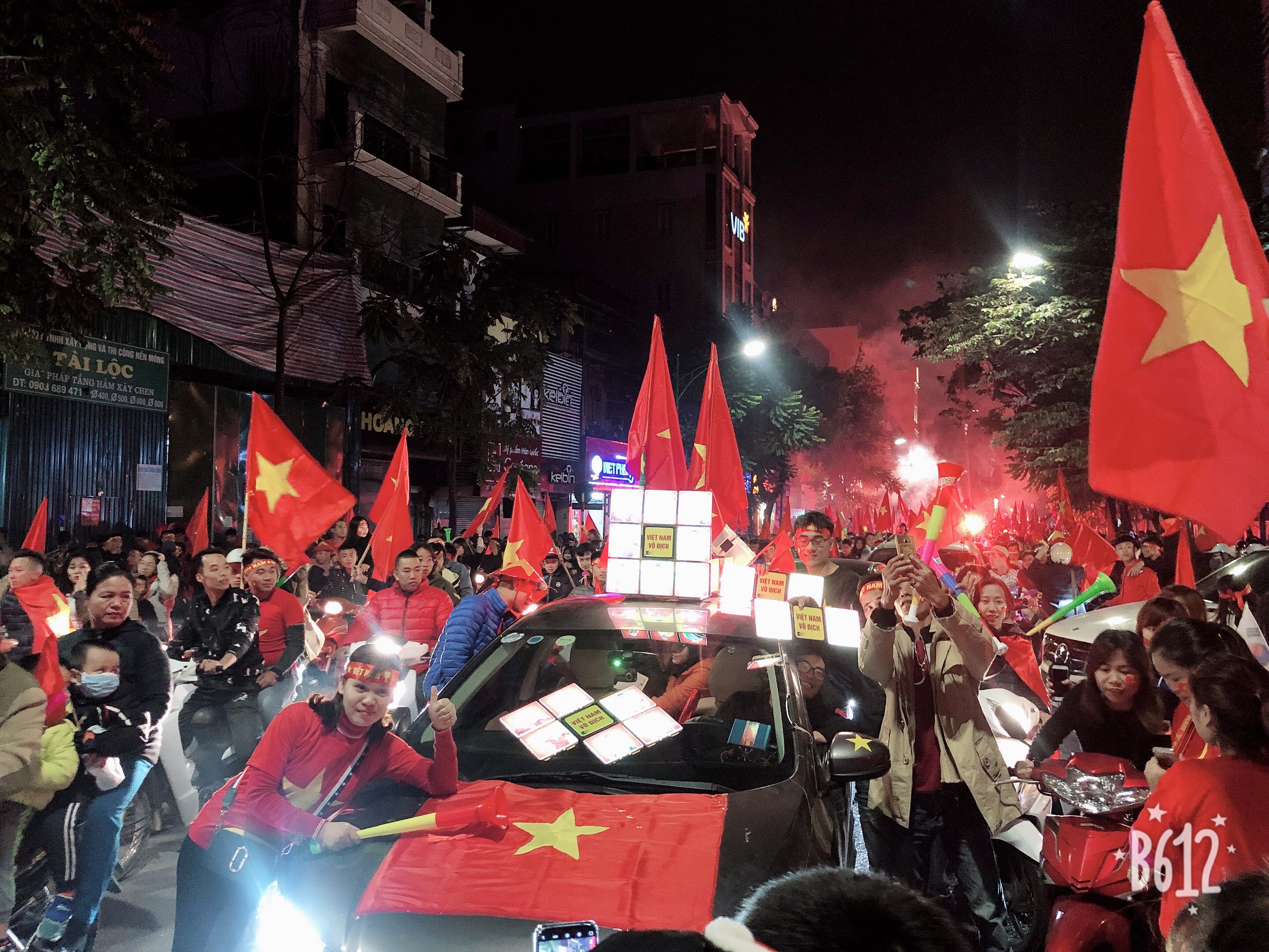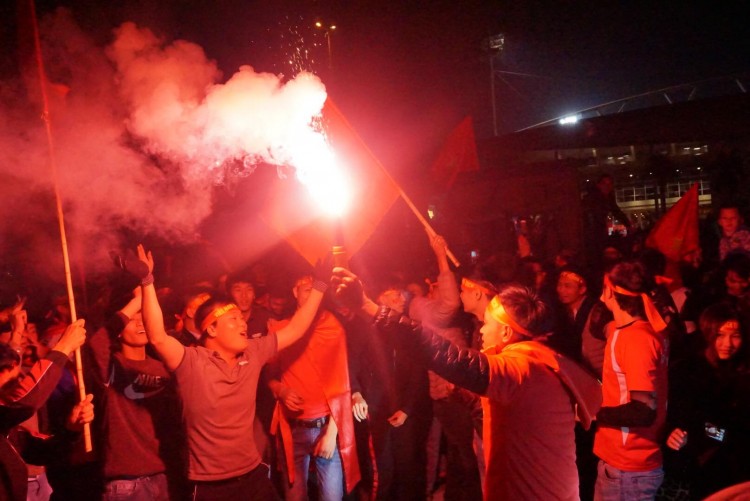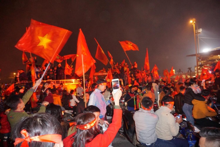 Điều tuyệt vời nhất được tạo nên trong đêm bão mừng vô địch là sắc đỏ ngập tràn. Màu đỏ nhỏ nhoi trên tuyết trắng Thường Châu ngày nào giờ đây đã lan thành cả một biển đỏ rực, đó là lá cờ Tổ quốc được giơ cao; những băng rôn in dòng chữ “Việt Nam vô địch” buộc vào tay, vào đầu người hâm mộ; vô số miếng dán lên tay, lên mặt, lên cả những chiếc đèn phát sáng đầy sáng tạo, dán luôn tình yêu và niềm vui chiến thắng ngày hôm nay vào sâu trong tim mỗi con người Việt.