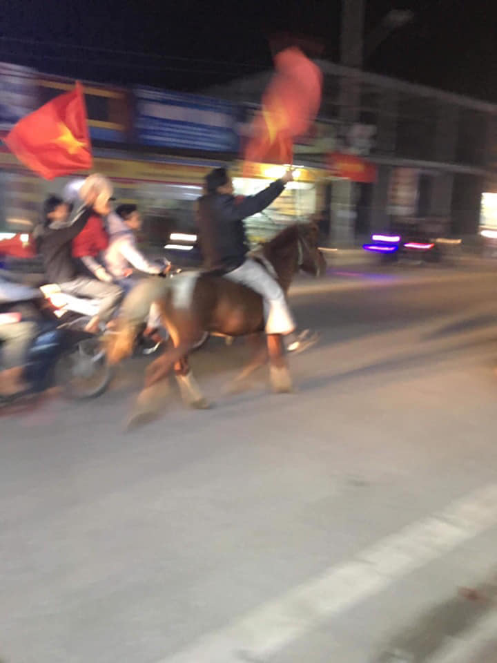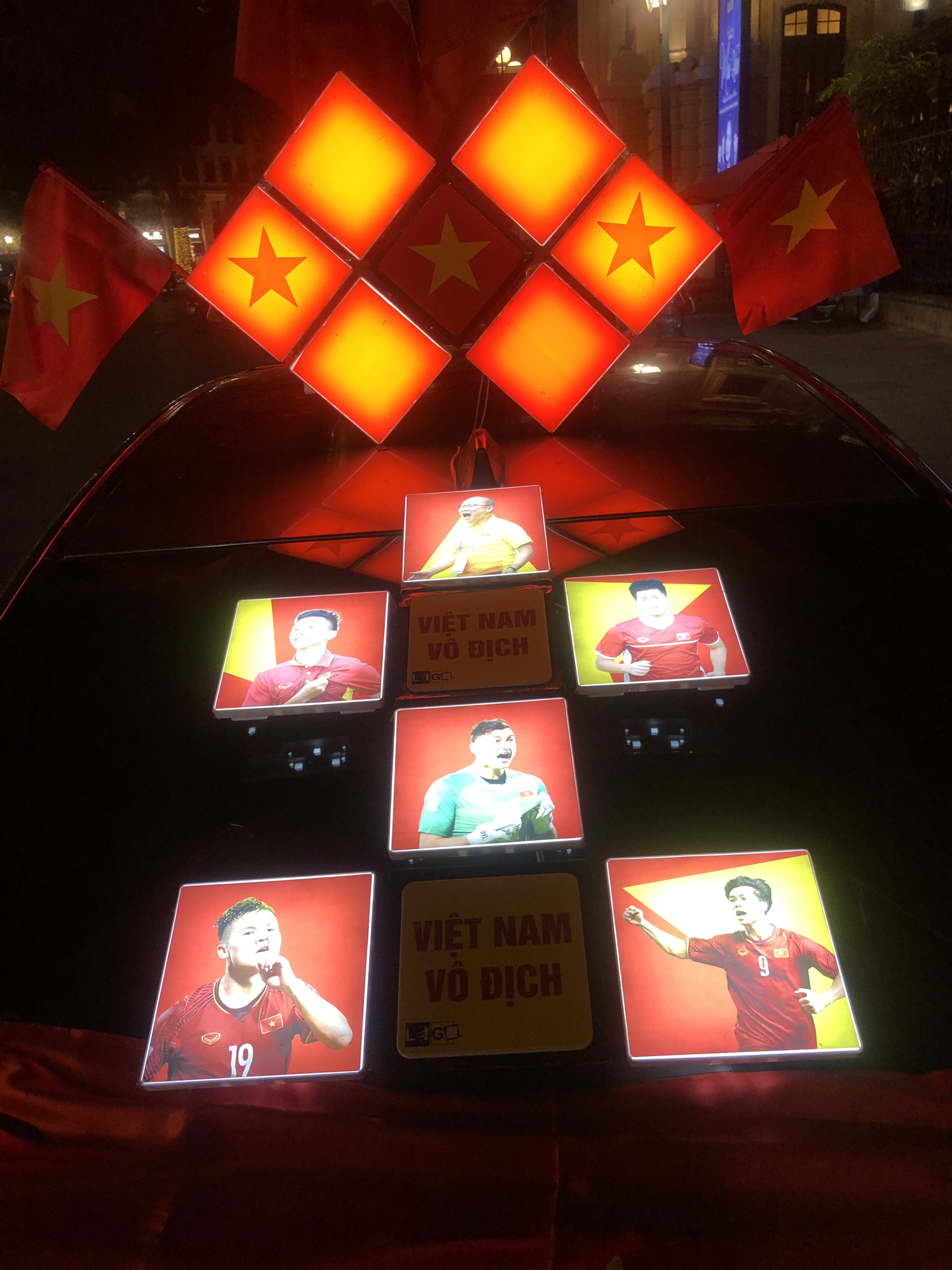 Không những hòa chung vào biển đỏ, người hâm mộ Việt Nam còn làm đẹp thêm đêm bão bằng những sáng tạo rất riêng. Đó là chiếc xe được trang trí hoành tráng bằng đèn ghép khối dán hình đội tuyển Việt Nam, sáng rực “chiếm trọn spotlight”; đó là những chiếc pháo sáng được đốt lên, các cổ động viên di chuyển bằng ngựa, người hâm mộ hóa trang thành những nhân vật nổi tiếng… Qua lăng kính của mỗi con người Việt Nam ngày hôm nay, “cơn bão đêm” ăn mừng cúp vô địch đã trở thành một lễ hội văn hóa tráng lệ, lộng lẫy, với đầy đủ âm thanh, ánh sáng và tinh thần tột bậc.