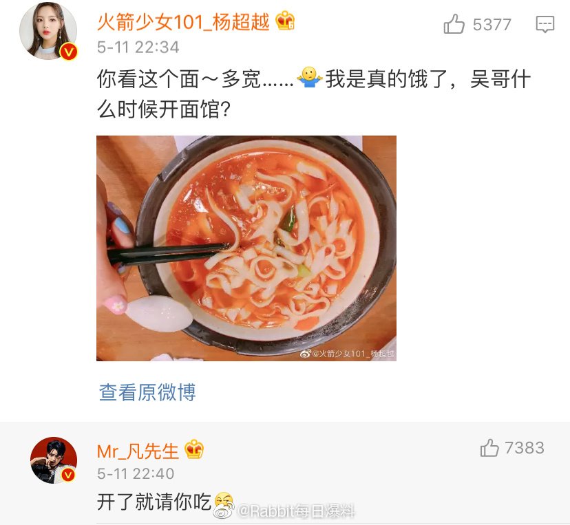Sau buổi “tiệc tùng” hoành tráng, Dương Siêu Việt đã chia sẻ cảm nghĩ của mình trong một bài viết trên mạng xã hội Weibo: “Hãy nhìn những sợi mì này ~ thật dày đúng không ạ……Tôi thực sự đói bụng, Ngô đại ca, khi nào anh mới mở nhà hàng mì ạ?”. Ngôn Diệc Phàm trả lời: “Một khi anh mở nhà hàng, anh sẽ mời em đến đó ăn”.
