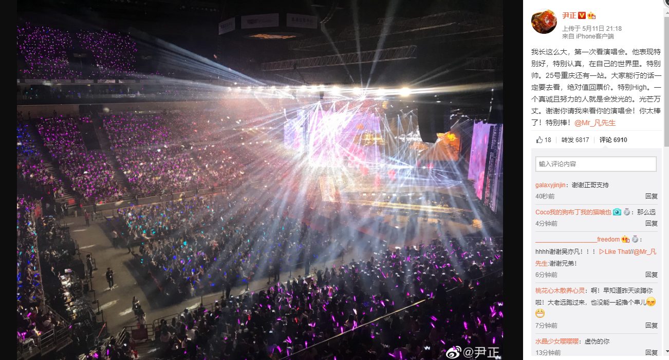 Diễn viên Doãn Chính cũng trải lòng: “Tôi lớn như này, đây vẫn là lần đầu tiên đi xem hòa nhạc. Cậu ấ biểu hiện đặc biệt tốt và nghiêm túc ở trong thế giới của chính mình. Vô cùng đẹp trai luôn. Ngoài ra còn có một buổi biểu diễn vào ngày 25 sắp tới ở Trùng Khánh nữa. Nếu có thể, các bạn nhất định phải đi xem nha, tuyệt đối đáng tiền vé bỏ ra. Rất hoành tráng đấy. Một người chân thành mà lại cố gắng nhất định sẽ tỏa sáng. Diệc Phàm à, cảm ơn em vì đã mời anh đến xem concert của em! Em quá tuyệt vời! Rất giỏi'.