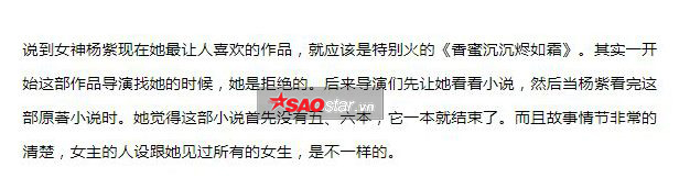 Kỳ thực, ban đầu khi đạo diễn Hương mật tựa khói sương (香蜜沉沉烬如霜) tìm Dương Tử đóng phim, cô đã thẳng thừng từ chối. Nhưng sau đó đạo diễn cho Dương Tử xem tiểu thuyết, Dương Tử sau khi xem xong tiểu thuyết nguyên tác thì thấy tiểu thuyết này không giống như những tiểu thuyết khác có đến 5-6 cuốn, mà chỉ một cuốn là kết thúc. Hơn nữa cốt truyện còn rất rõ ràng, cách thiết kế nhân vật nữ chính cũng hoàn toàn khác với những người con gái khác mà Dương Tử đã từng gặp.