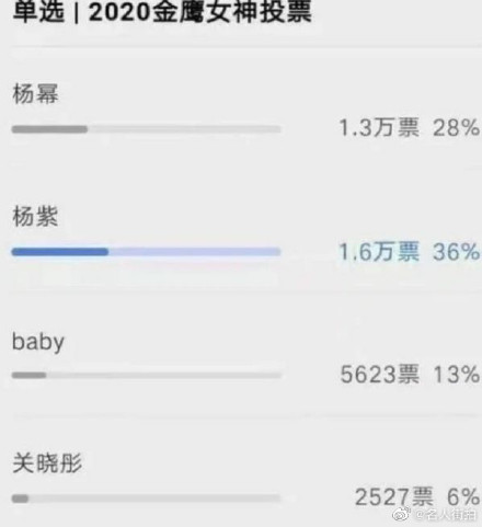 Người nhận được phiếu bầu cao nhất cho danh hiệu nữ thần Kim Ưng năm nay chính là Dương Tử với tổng 16 ngàn phiếu bầu, chiếm 36%. Vào năm 2018, nữ diễn viên cũng được xem là ứng cử viên đắt giá cho danh hiệu này khi cạnh tranh ‘một mất một còn’ với Địch Lệ Nhiệt Ba. Nhưng kết quả cuối cùng, Địch Lệ Nhiệt Ba không những dành được vị trí này mà còn ôm trọn hai giải thưởng cao quý khác của giải Kim Ưng là Nữ viên viên có nhân khí cao nhất và Nữ diễn viên được yêu thích nhất.