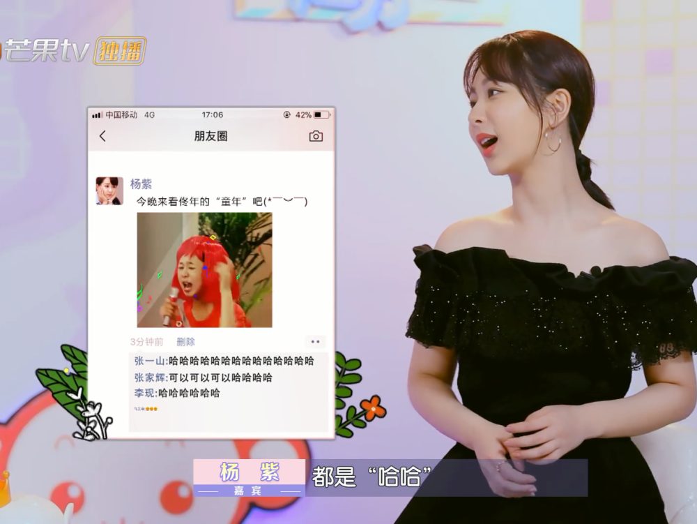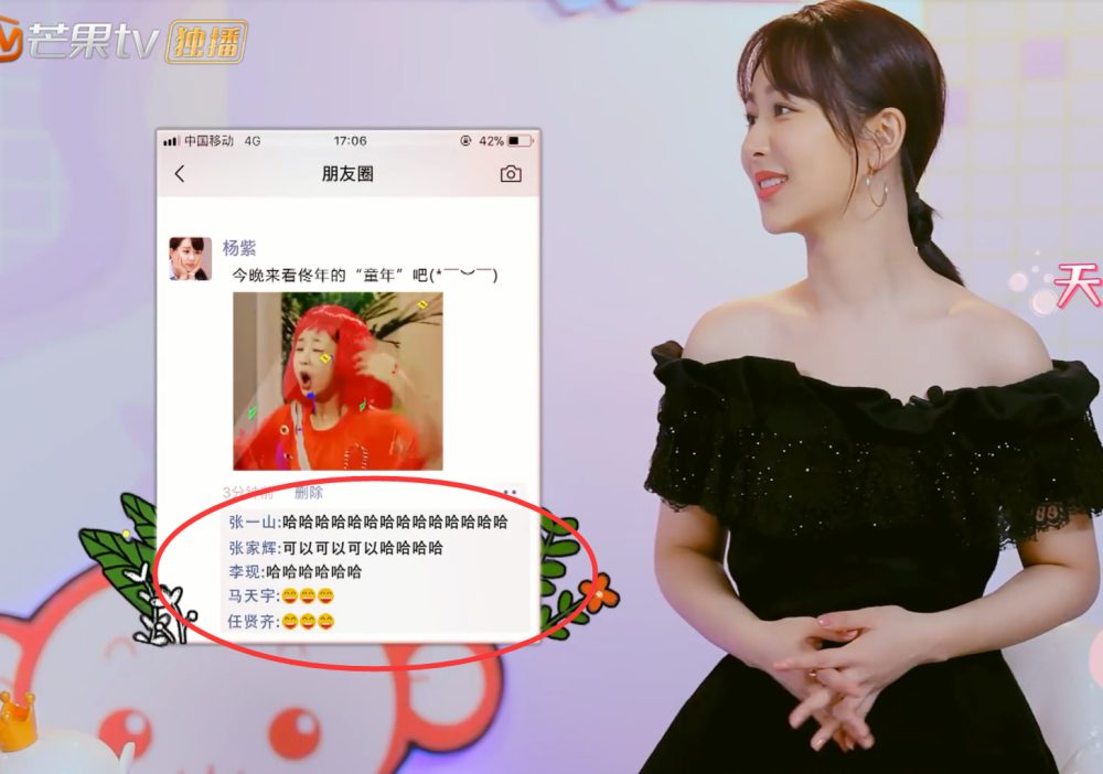 Giữa chương trình, MC còn nhắc đến một số vấn đề liên quan đến Lý Hiện, bao gồm cả trong cuộc sống. MC càng hiếu kỳ hơn muốn xem vòng bạn bè của Dương Tử. Không ngờ Dương Tử thật sự tiết lộ vòng bạn bè, bài đầu tiên của cô chính là tên “Đồng Niên” - nữ chính cô đảm nhận trong phim, nhưng điều khán giả quan tâm không phải bài viết mà là một số bình luận dưới bài viết đó.