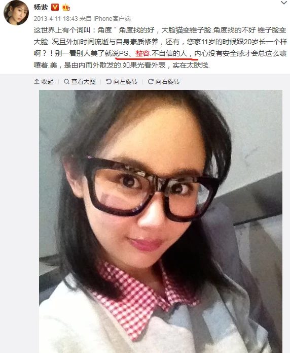 Bên cạnh thực lực thì nhan sắc cũng là một trong những vấn đề của minh tinh được khán giả quan tâm nhất. Từng nhiều lần Dương Tử vấp phải nghi vấn phẫu thuật thẩm mỹ khi có nhiều chi tiết, đường nét trên khuôn mặt thay đổi so với trước đây. Nhưng nàng tiểu hoa liên tục phủ nhận, thậm chí còn chỉ trích lại dân mạng, cô cho biết: “Đừng thấy người khác xinh đẹp liền nói photoshop, phẫu thuật thẩm mỹ…”