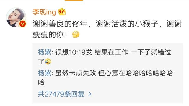 Trước đó, Dương Tử còn đăng tải nội dung chúc mừng sinh nhật Lý Hiện, sau đó anh chàng đã trả lời lại và đặc biệt là dùng tính từ ôm ốm để nói về Dương Tử. Có thể thấy được Dương Tử không ít lần nói với Lý Hiện rằng bản thân rất ốm, bản thân không mập tí nào một cách thân thiết, giống như chị em trong gia đình.