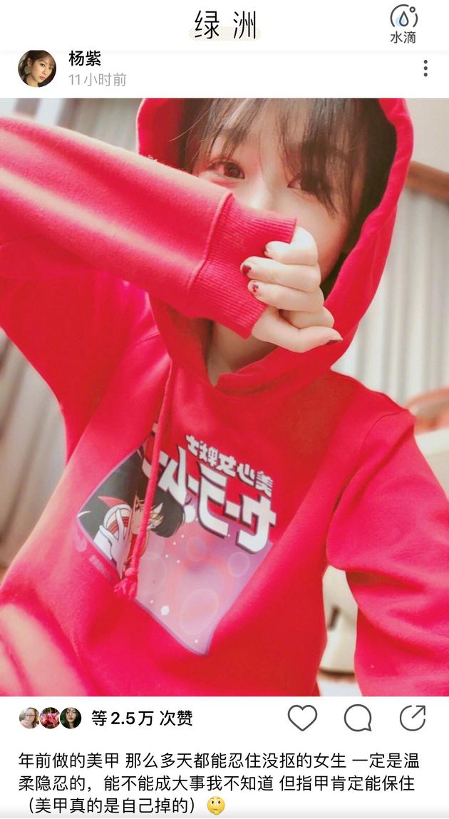 Trong bức ảnh, Dương Tử mặc áo len đỏ, đội mũ trẻ trung và tràn đầy sức sống, che một nửa khuôn mặt bằng đôi tay vô cùng đáng yêu.Hình ảnh selfie của cô nàng được rất nhiều người quan tâm vì đây là bức hình selfie đầu tiên của cô nàng kể từ khi sau dịp Tết Nguyên đán, cô nàng đã đăng tải bài viết này vào 11 giờ khuya, nhiều khán giả đã để lại lời nhắn cho cô nàng: “ngủ sớm đi cô nàng ơi, chú ý sức khoẻ là điều quan trọng nhất. Bạn không nên thức khuya, như vậy da sẽ nhanh lão hoá đấy!”. Tuy nhiên, mục đích của Dương Tử lần này không phải khoe mặt mà chính là “khoe” bộ móng tay. Cô nàng chia sẻ trong bài đăng: “Bộ móng tay của tôi đã làm từ nhiều năm về trước và bây giờ nó trở nên loang lổ như vậy, tại vì tôi cảm thấy rằng móng tay không quan trọng lắm cho nên tôi cũng không chú ý đến nó nhiều”.