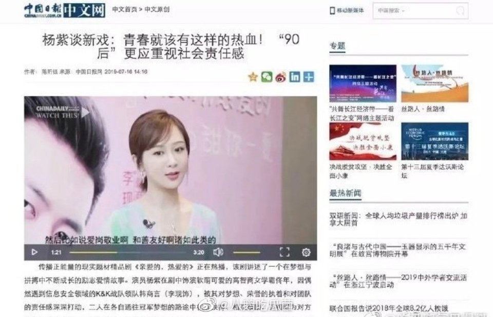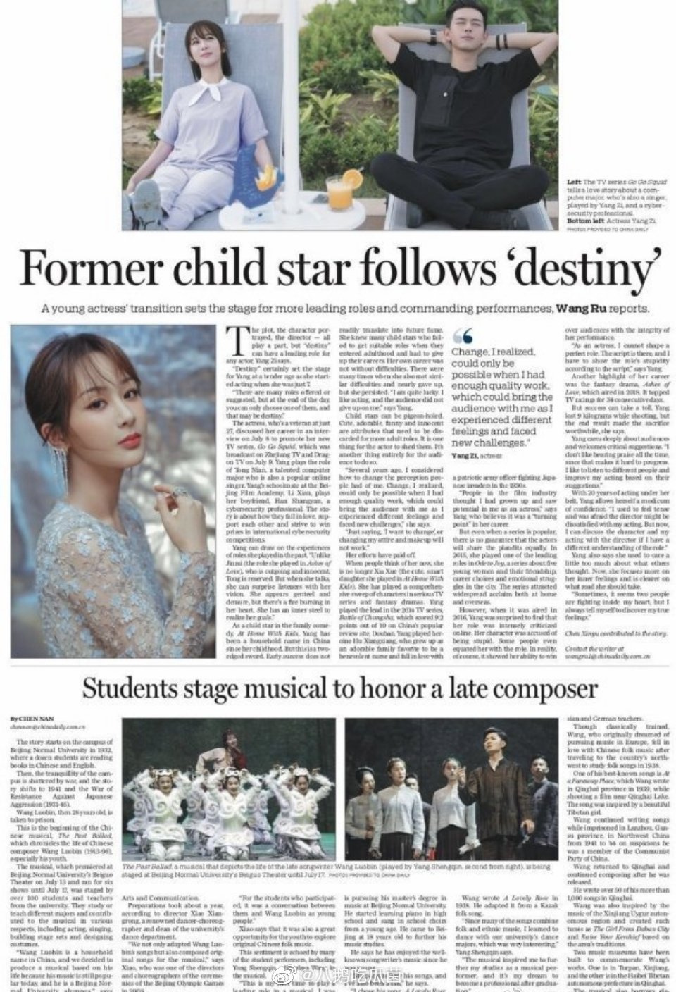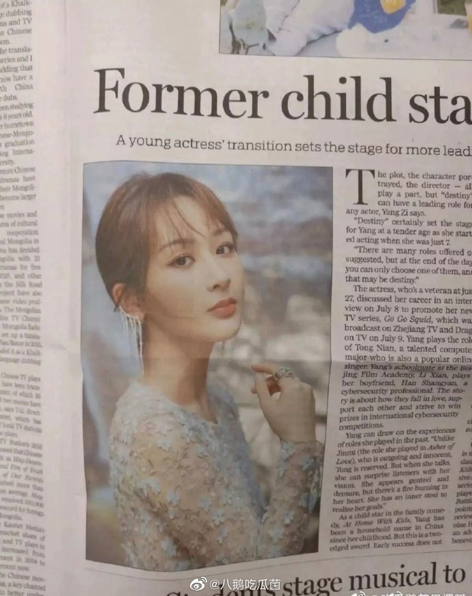 Mới đây nhất, Dương Tử đã xuất hiện trên Nhật Báo Trung Quốc. Được biết, Nhật Báo Trung Quốc là báo giấy Trung Quốc có lượng tiêu thụ cao nhất trong và ngoài nước. Dương Tử còn chiếm đến 2/3 mặt báo, đây được xem là sự công nhận rất lớn của trung ương dành cho nữ diễn viên.