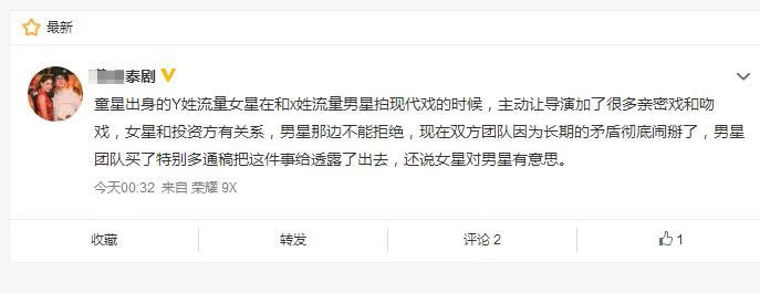 “Thời điểm quay bộ phim chủ đề hiện đại, nữ minh tinh Y xuất thân từ ngôi sao nhí cùng sao nam X đỉnh cấp lưu lượng đã xảy ra một vấn đề. Phía nữ chủ động yêu cầu đạo diễn tăng thêm rất nhiều cảnh thân mật và hôn nhau. Nữ minh tinh có quan hệ với nhà đầu tư thế nên bên phía nam tài tử không thể cự tuyệt!”.