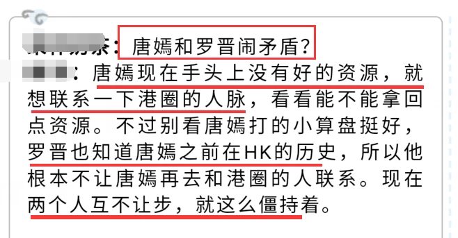 Ngày 19.11, một blogger nổi tiếng trong giới tiết lộ chuyện mâu thuẫn giữa Đường Yên và La Tấn. Theo đó, nguồn tin này bày tỏ Đường Yên đang thiếu đi nguồn tài nguyên tốt (dự án thương mại, phim ảnh, quảng cáo,…). Cô dự định sẽ liên lạc với mối quan hệ, giao thiệp trong vòng giải trí Hong Kong, hy vọng sẽ mang về cho mình tài nguyên đích đáng.