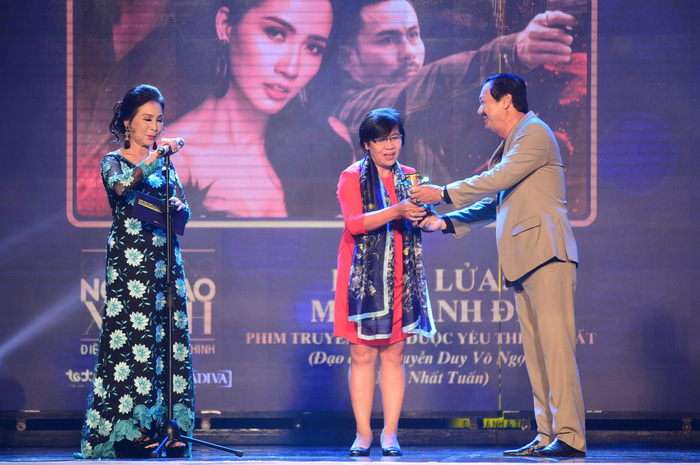 Bà Bích Thủy lên nhận giải thưởng phim Hồ sơ lửa - Mật danh Đ9 được khán giả bình chọn nhiều nhất. (Ảnh: Báo Tuổi trẻ)