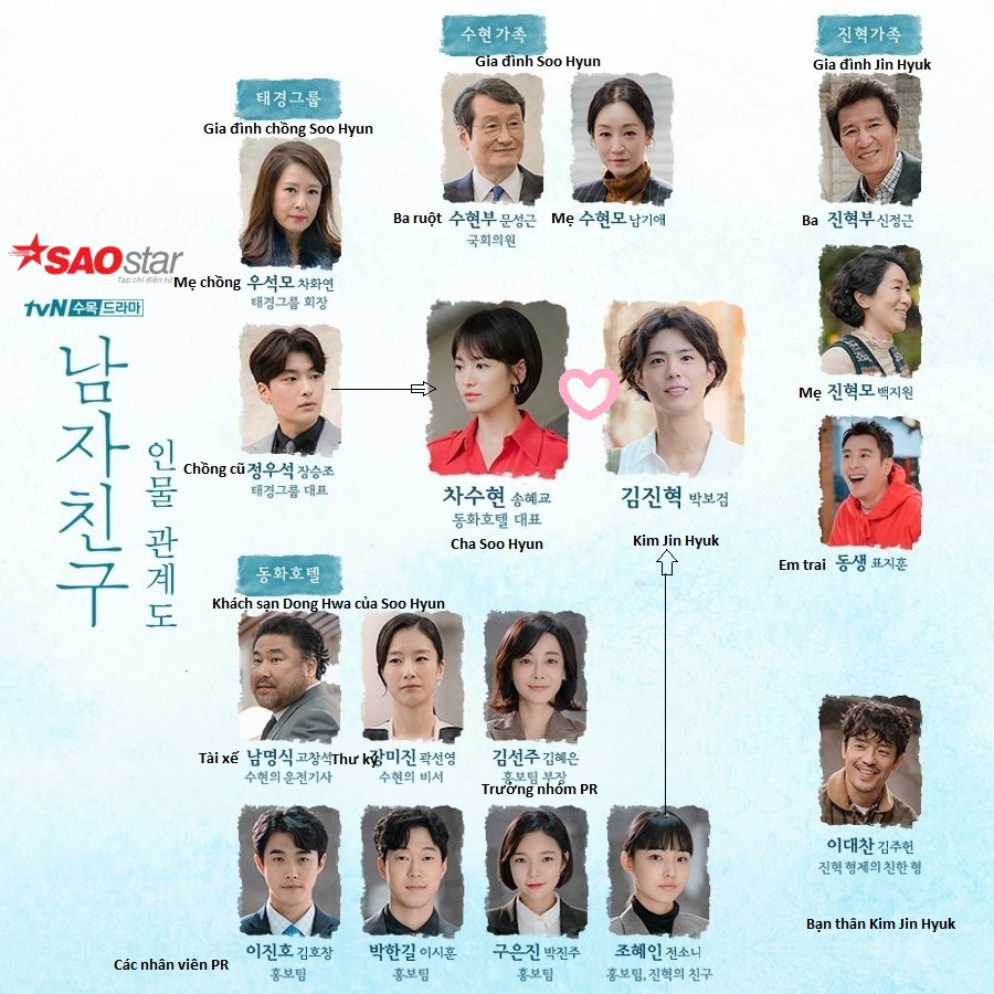 Vào ngày 23/11, tvN drama đã phát hành bản đồ về mối quan hệ giữa các nhân vật có liên kết với cặp đôi chính Cha Soo Hyun và Kim Jin Hyuk của bộ phim Encounter/Boyfriend (남자친구) do Song Hye Kyo và Park Bo Gum dẫn đầu. Thông qua đó, khán giả sẽ có cái nhìn khách quan và dễ hiểu hơn về các nhân vật trong dự án sắp tới này. Ngoài ra, chúng ta cũng có thể phán đoán được một số tình tiết chính nhờ vào bức ảnh này.