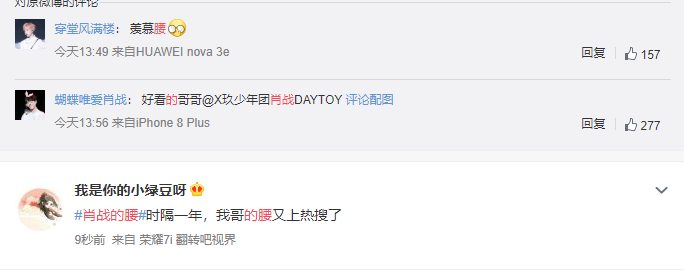 “Hội chị em” để lại khá nhiều bình luận trên Weibo như “Ngưỡng mộ vòng eo này”, “Một năm sau, eo của anh yêu tôi lại lần nữa lên nhiệt sưu”,… Eo của Tiêu Chiến đã từng là đề tài nóng hổi của mọi người bởi vì anh chàng sở hữu thân hình có tỷ lệ hoàn mỹ. Vòng eo của anh chàng có thể nói là nhỏ khi đem so sánh với một số cô gái.