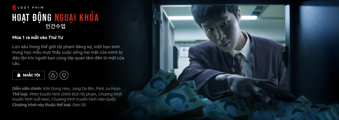 Với dàn diễn viên chính bao gồm Kim Dong Hee, Jung Da Bin, Park Joo Hyun, kèm theo đó là cốt truyện cực kì kịch tính, lôi cuốn Extracurricular chắc chắn sẽ là bộ phim được tất cả những ai là fan của thể loại hình sự - đen tối theo đuổi.